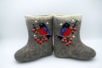 Серые детские валенки ручной валки с вышивкой "Снегирь" (самовалки).