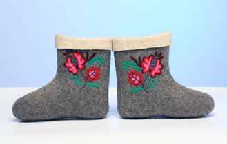 Женские серые полуваленки ручной работы с вышитыми узорами “Розовые вихри” (самовалки)